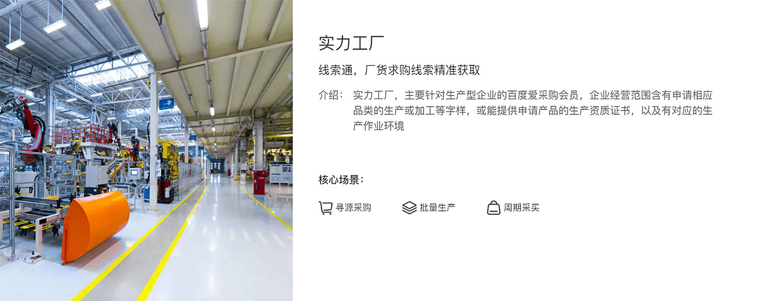 主要針對生產(chǎn)型企業(yè)的百度愛采購會員,企業(yè)經(jīng)營范圍含有申請相應品類的生產(chǎn)或加工等字樣,或能提供申請產(chǎn)品的生產(chǎn)資質證書,以及有對應的生產(chǎn)作業(yè)環(huán)境